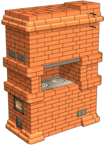 Большинство отопительно варочных печей и кухонных очагов спроектированы по схеме «двухъярусный колпак», что отличает их от других схем движением дымовых газов повышенной теплоотдачей, где первые дымовые газы из топливника поступают в нижнюю половину отопительного щитка, а затем – в верхнюю. В результате – поверхность варочной колпаковой печи по всей высоте прогревается равномернее.